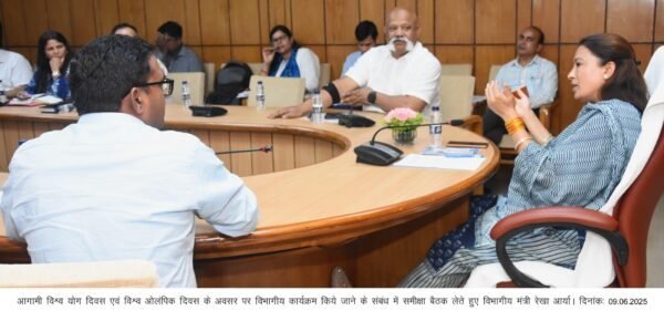 देहरादून : प्रदेश की खेल मंत्री रेखा आर्या ने आज विधानसभा स्थित सभागार कक्ष में आगामी 21 जून को विश्व योग दिवस एवं 23 जून को अन्तर्राष्ट्रीय ओलंपिक दिवस के अवसर पर विभागीय कार्यक्रम किये जाने के संबंध में खेल विभाग एवं महिला सशक्तिकरण एवं बाल विकास विभाग की समीक्षा बैठक की।